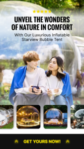 Apart from its practical features, our Starview Bubble Tent offers a unique blend of luxury and nature. Its transparent walls provide an unobstructed view of the night sky and surroundings, making it an unforgettable experience. Don’t wait! Transform your camping trips with our Luxurious Inflatable Starview Bubble Tent. Order now and embark on a journey of comfort and wonder under the stars.